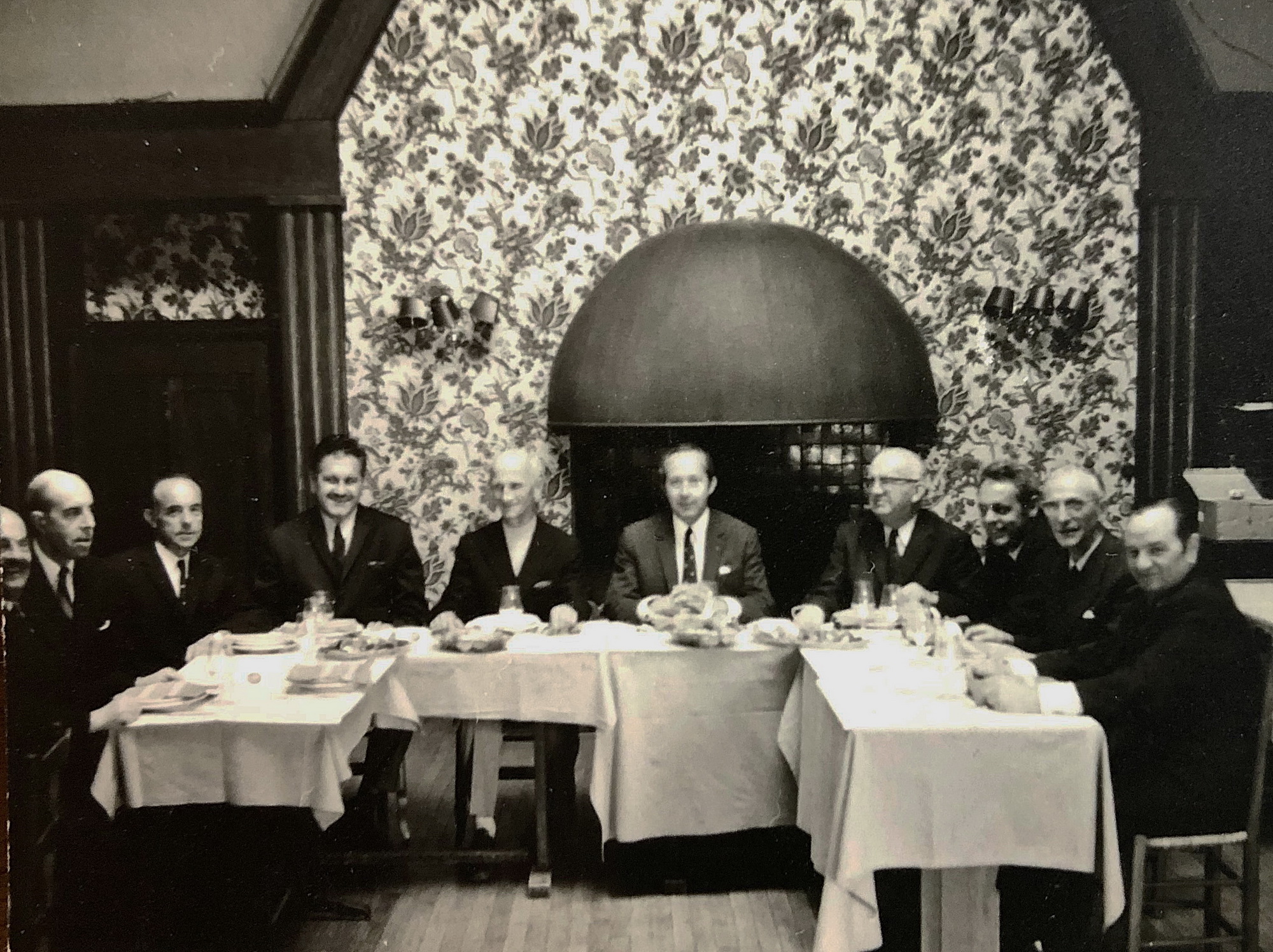 Une réunion (que d’hommes) sur une photo retrouvée récemment par JLC et JJV dans les archives du club un samedi de rangement. Peut-être une des premières réunion du Comité Marne de la FFT : 5/10 participants identifiés facilement (et un photographe inconnu ?) ; à commencer, à droite par Joseph(?) Valentin et pour finir par Pierre Folias à gauche avec un dernier portrait coupé et inconnu. Le document est sans date. La décoration murale n’est plus celle de 1923 (vrais/faux ? carreaux de faïence et guirlandes) attribuée à l’architecte E. Kalas de la SAVR voir l’image restituée en couleur de Laurent Antoine : https://tcreims.com/?p=3635
