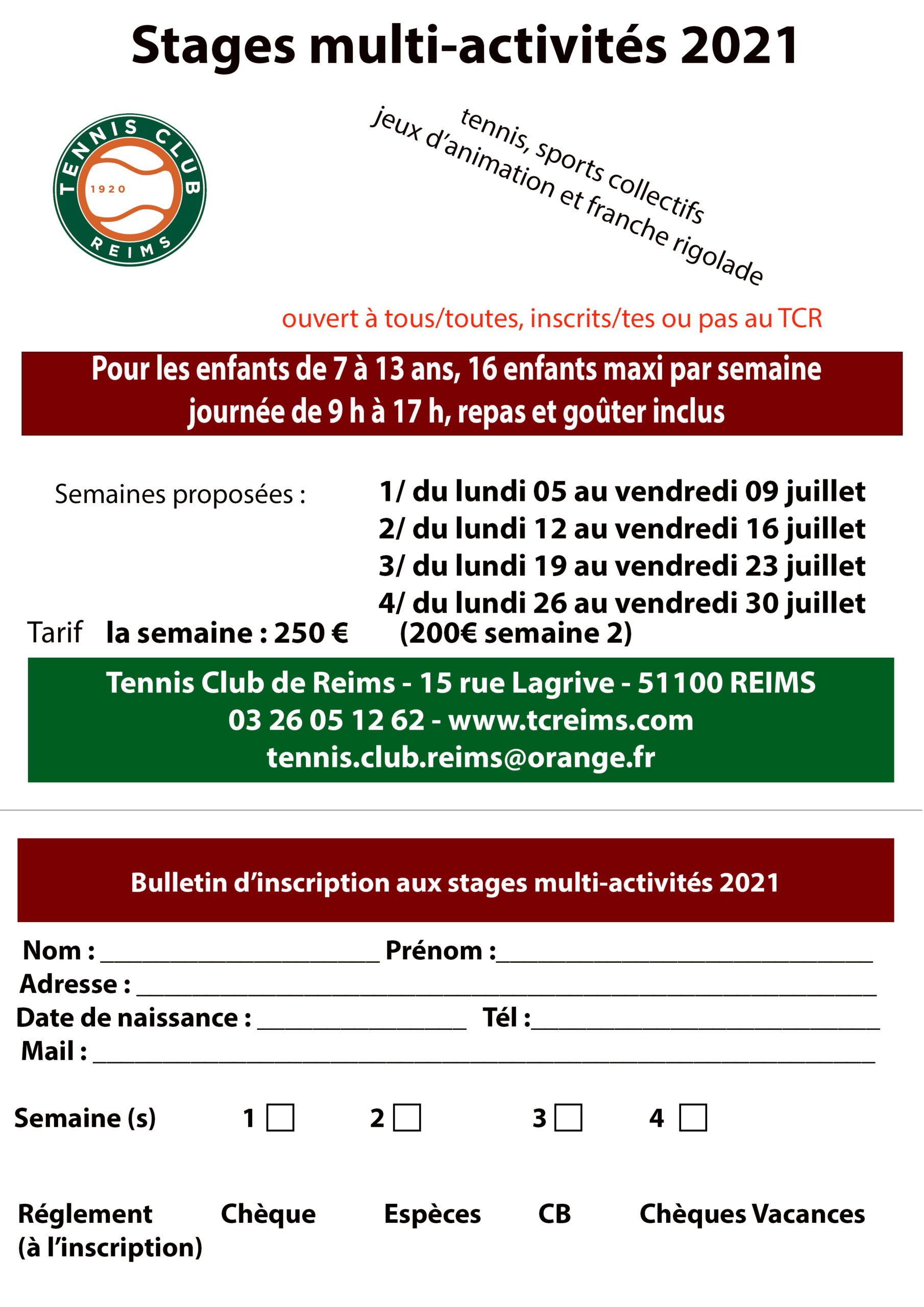 250 € la semaine ….4 semaines au choix … De 9 h à 17 h (repas et goûter inclus)… 16 enfants maximum de 7 à 13 ans …