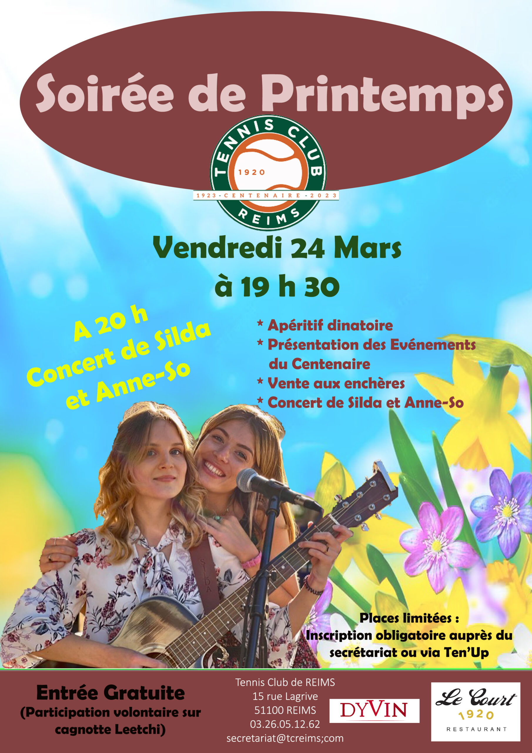 Le nombre de places étant limité merci de vous inscrire rapidement auprès du secrétariat à : secretariat@tcreims.com ou directement en ligne via Ten’Up en suivant le chemin : mon club – offres – soirée du 24 mars 2023.