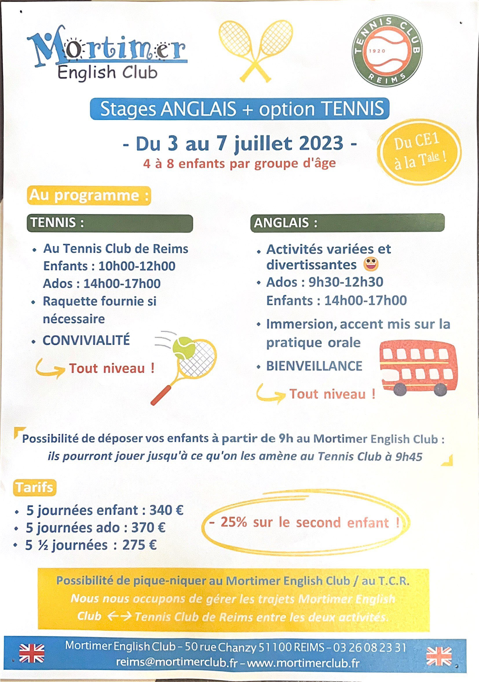Nous renouvelons pour cet été notre partenariat avec Mortimer English Club et nous vous proposons un stage Tennis-Anglais la 1ère semaine de Juillet.