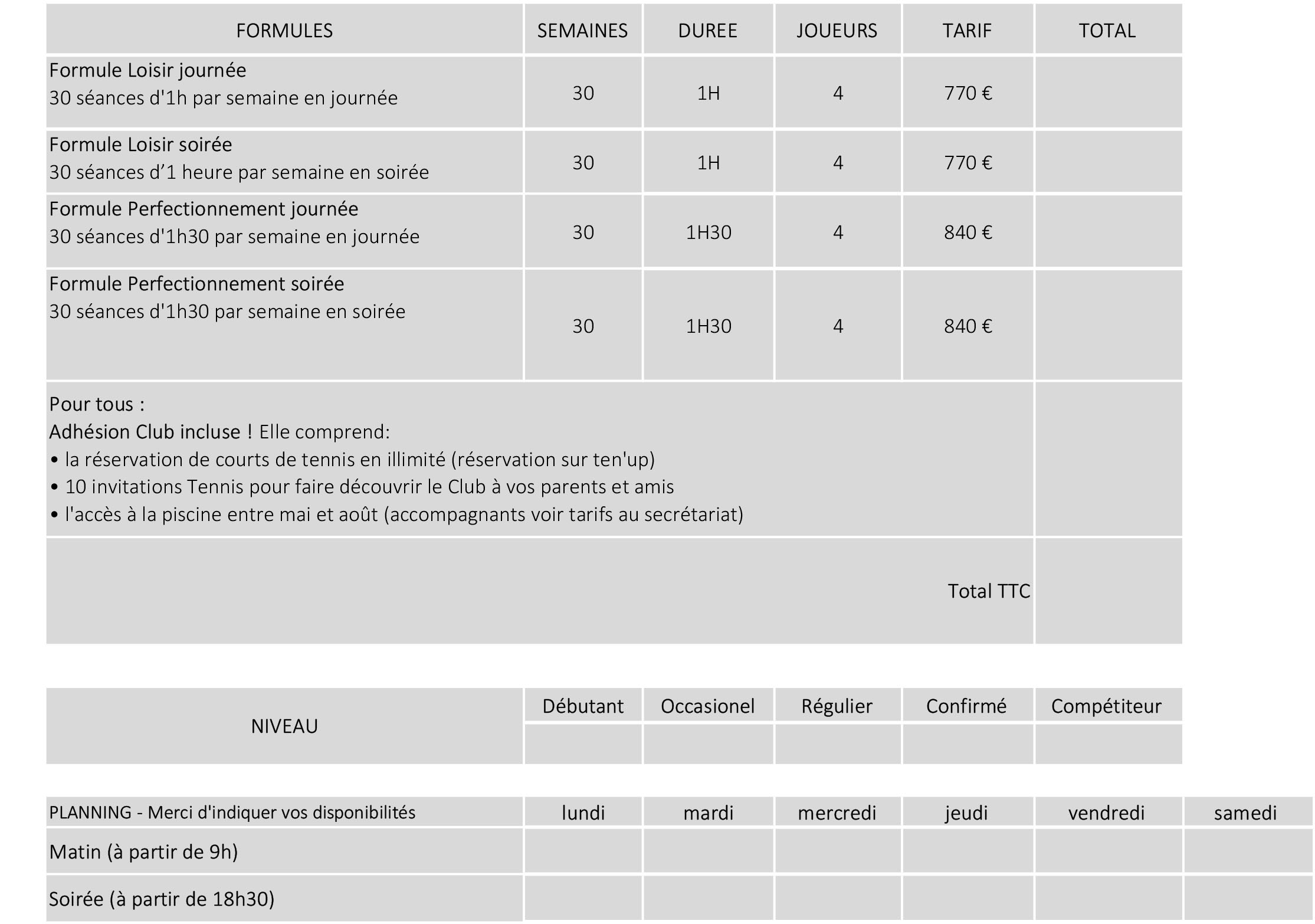 - Formule Perfectionnement soirée : groupe de 4 joueurs – 30 séances d’1h30 – 840€.