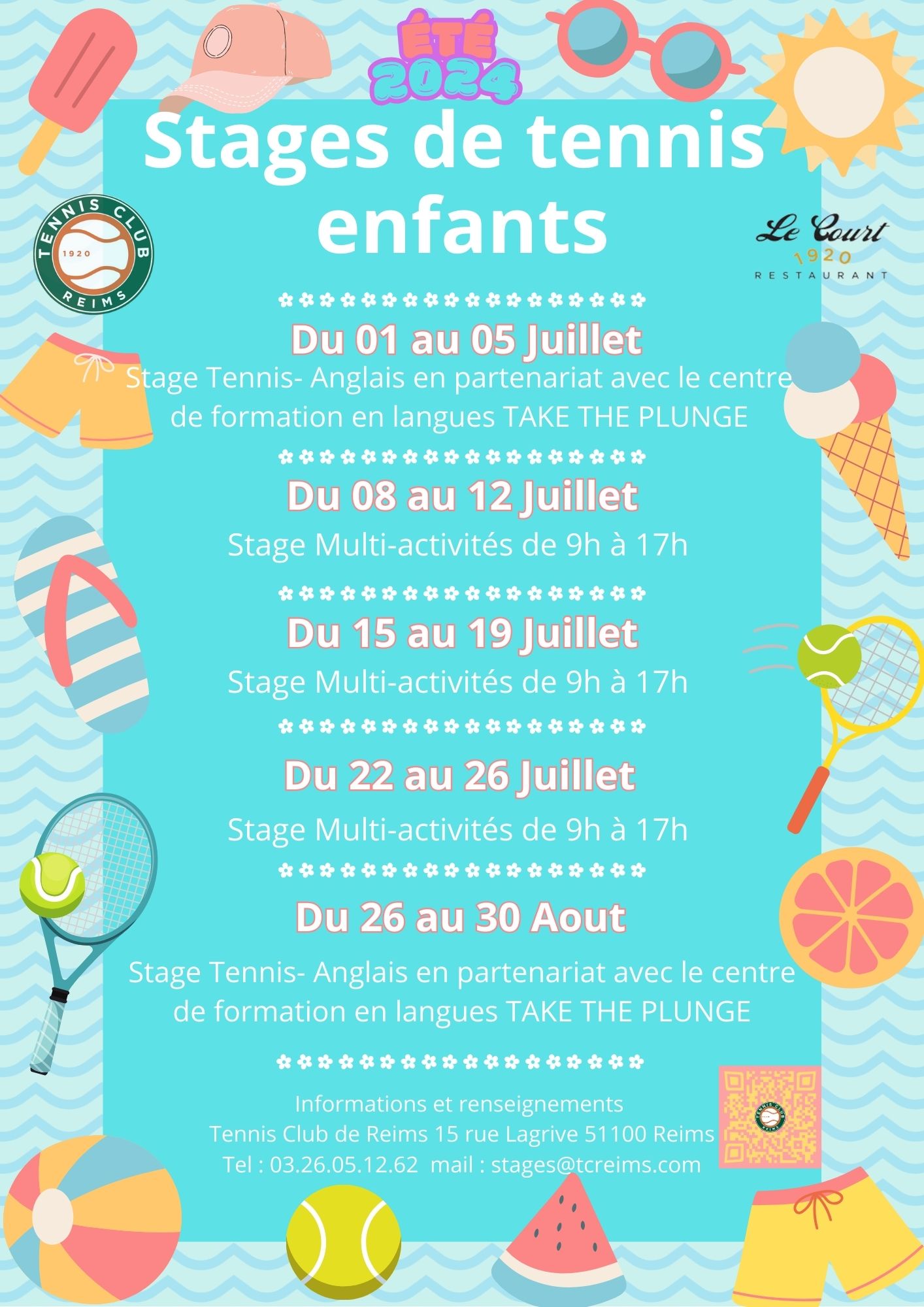 Le Tennis Club de Reims est heureux de vous annoncer le renouvellement de sa formule stage d’été les semaines du 08 juillet, du 15 juillet et du 22 juillet 2024