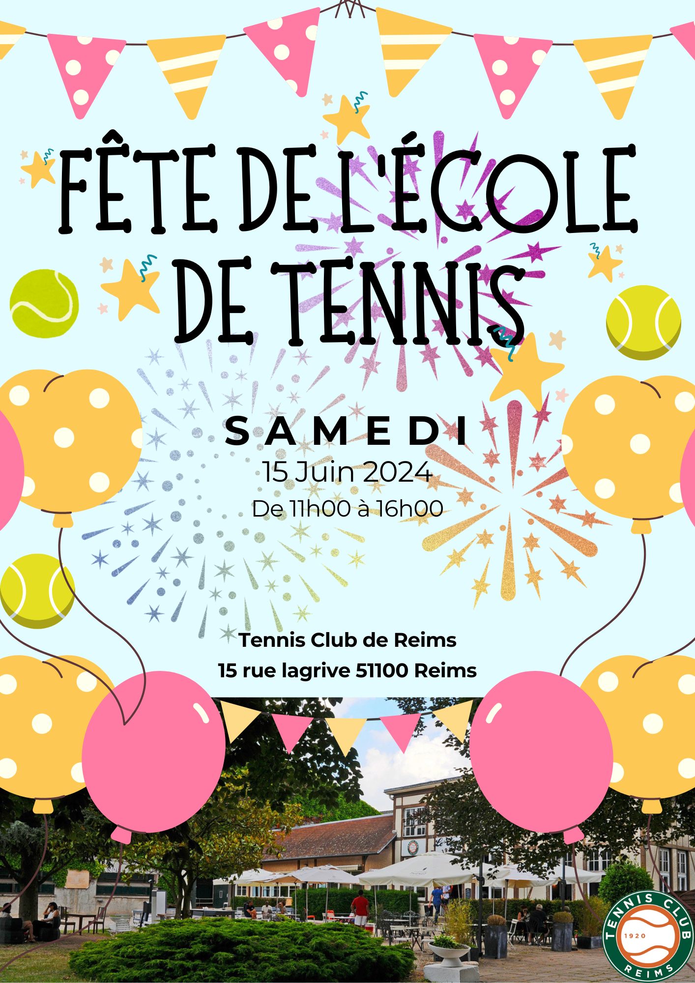 Pour célébrer la fin de la saison, nous vous invitons tous à nous rejoindre pour la fête de l’école de tennis qui aura lieu le samedi 15 juin.