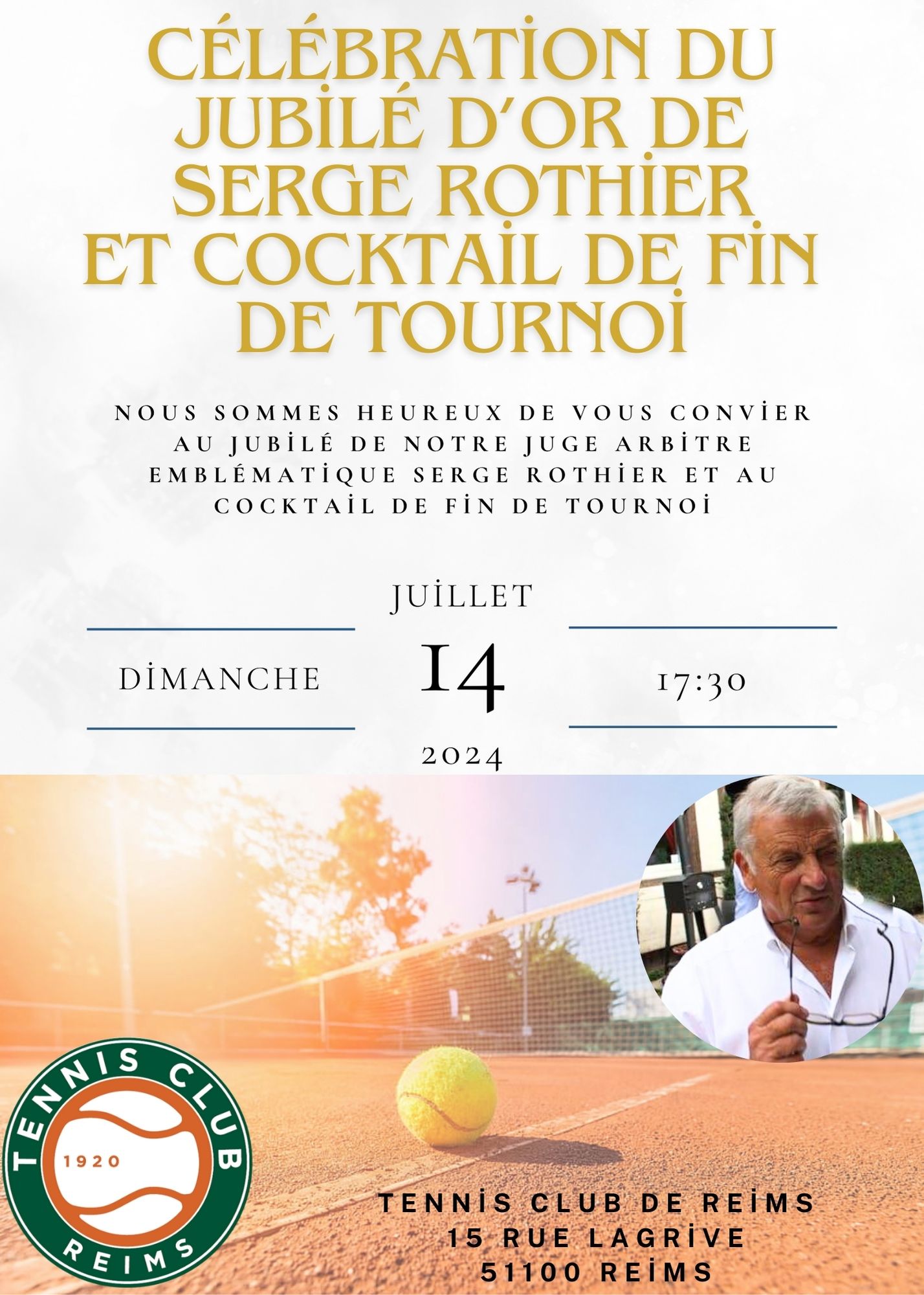 Pour conclure cet événement en beauté, nous vous convions à la remise des prix vers 17h30, suivie d’un cocktail de fin de tournoi et d’une célébration en l’honneur du Jubilé de notre emblématique Juge-Arbitre Serge Rothier, qui fêtera ses 50 années de bénévolat au service du tennis et du sport-santé bien-être.