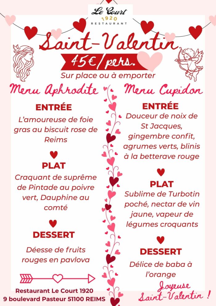 - Menu Aphrodite : Foie gras au biscuit rose de Reims, Suprême de Pintade et Pavlova aux fruits rouges.